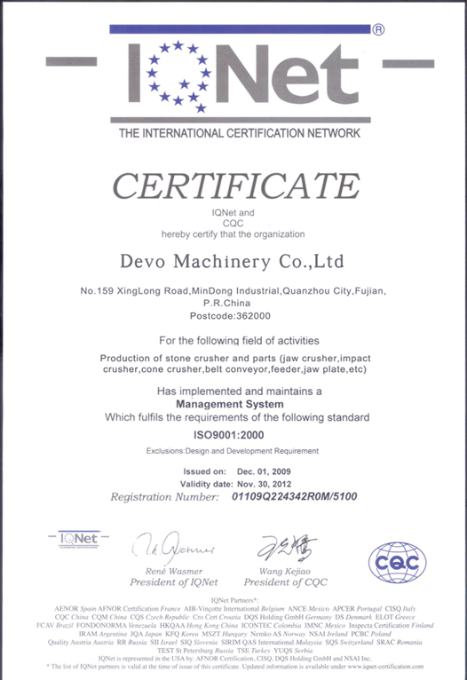 Devo Machinery Co., LTD is a professional manufacturer of crushing and powder making equipment, located in Quanzhou, Fujian, Boasts its ****0 square meters production base and owns complete modernized metal cutting equipment, equipped with advanced Solidworks 3D mechanical design and Computerized Simulation Test System. Through *0 years's development, Devo Machinery has been one of the largest crusher manufacturers in China. .Till now , we have formed a complete production chain with main products :crushing machinery , grinding machinery , vibrating screen , vibrating feeder , sand making machine, stone crusher, crusher spare parts, and other associated equipments. From the development to designing , and production to after-sales service , Devo pursues perfect and high-efficiency in every aspects. With the High technology , high reliability and low maintenance cost , Devo products have been exported to more than *6 countries and are widely used in global mining and construction industry. As the leading export company in crushing & milling field, we have developed series of newly-designed crushers by absorbing advanced scientific technology & processing experience from abroad and ourexperts' continuous research, it proved that our crushing products enjoyed agood market both in domestic and overseas for its high quality & easy maintenance. "Devoted to the world" is our Enterprise Culture, as it states, we are always pursuing high standard manufacturing and qualified products. Devo Machinery has cultivated a professional technology and after-sales service team, and successfully achieved ISO********0 Quality Management Certificate and EU CE Certificate. Honor creates success, innovation creates prosperity. We will never stop our footsteps in pursuing better quality and better service to make a greater contribution to the people in the world. "DEVO" is ready to be your reliable partner! We will inherit the management aim to offer our customer the better quality products with reasonable prices and considerate service . we would like to cooperate and establish friendly business relationship with customers at home and abroad!
